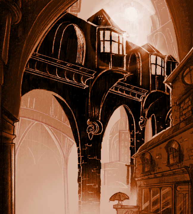 The concept of my work comes from the use of fantasy and gaming as not just a tool for escapism, but for communication and therapeutic purposes. Though the nature of a TTRPG is to move and change with the whims of its players, the starting point designated for players is an industrial post-war world where the bonds between different groups of people have worn thin. The player characters, bonded together by a singular magical artifact of the world before, must collaborate and communicate in order to successfully deliver the artifact to its final destination. Our world is familiar with these themes already – war, separation, bias, lack of communication, the loss of something precious – and by presenting these topics in a fantastical, comforting situation, the hope is to give players a place to safely act out their fears and concerns and encourage real-world conversation about these topics.